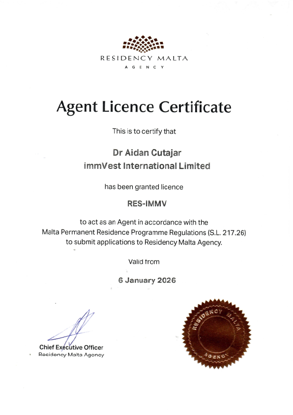 Dr. Aidan Cutajar LL.B (Hons.) M.Adv. (Melit.), on behalf of immVest International Limited, has been officially recognised as a Residency Malta Agency Accredited Agent (RES-IMMV).